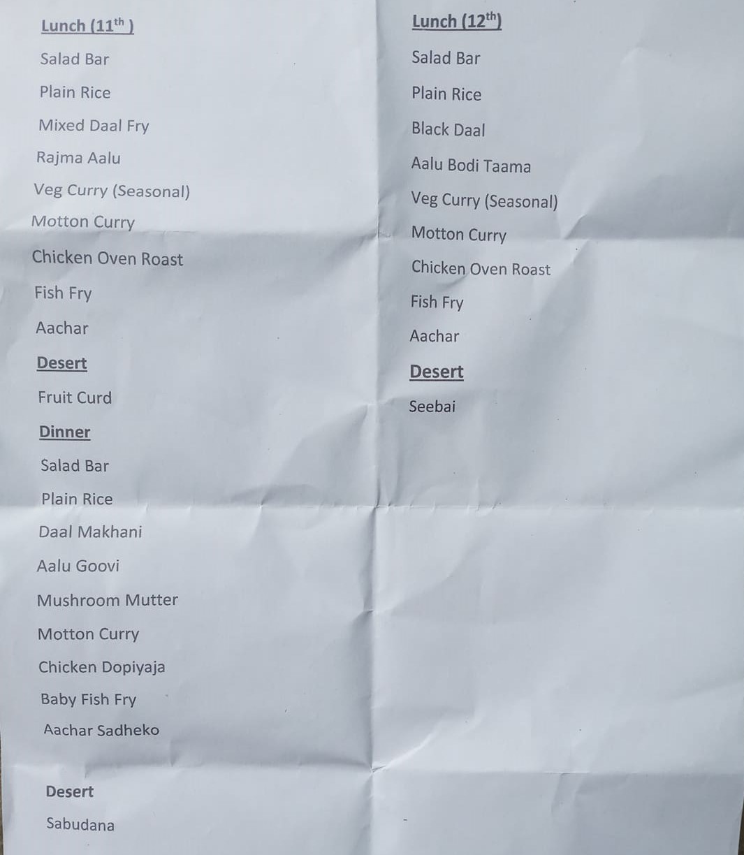 त्यस्तै अन्तिम तथा तेस्रो छाकमा भने सलाद बार, सादा खाना, कालो दाल, आलुबोडी तामा, भेज तरकारी, मटन करी, चिकन ओभन रोष्ट, माछा फ्राई, अचार र सिवाई रहने छ ।