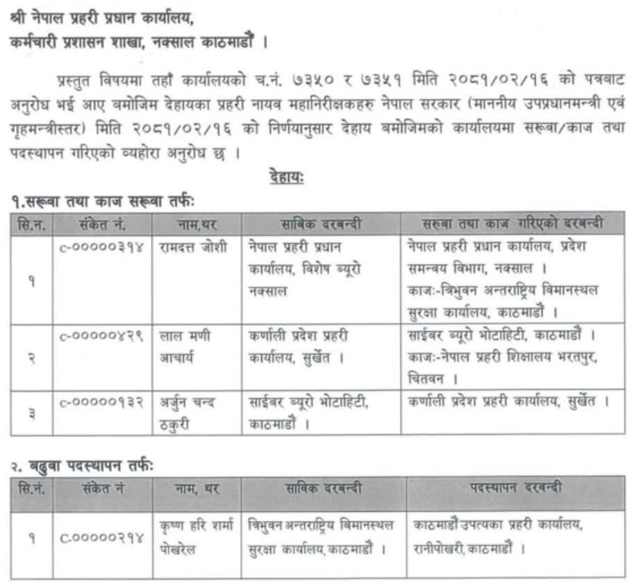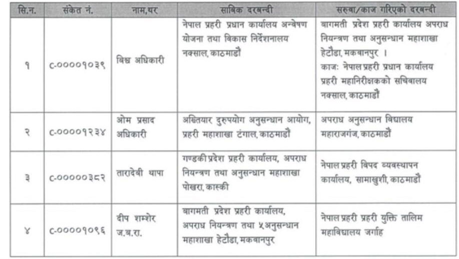 त्यसैगरी २० जना प्रहरी वरिष्ठ उपरीक्षक(एसएसपी)हरुको पनि सरुवा गरिएको सूची प्रशासनलाई प्राप्त भएको छ ।