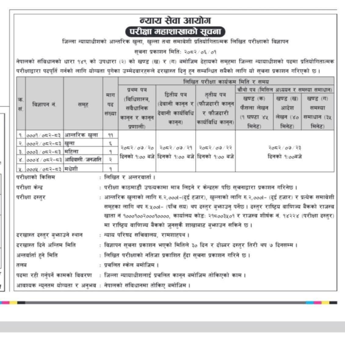 काठमाडौं । न्याय सेवा आयोगले जिल्ला न्यायाधीशका लागि दरखास्त आव्हान गरेको छ । आज सूचना जारी गर्दै विभिन्न क्लस्टरमा योग्य व्यक्तिले निवेदन दिन आह्वान गरेको हो ।
