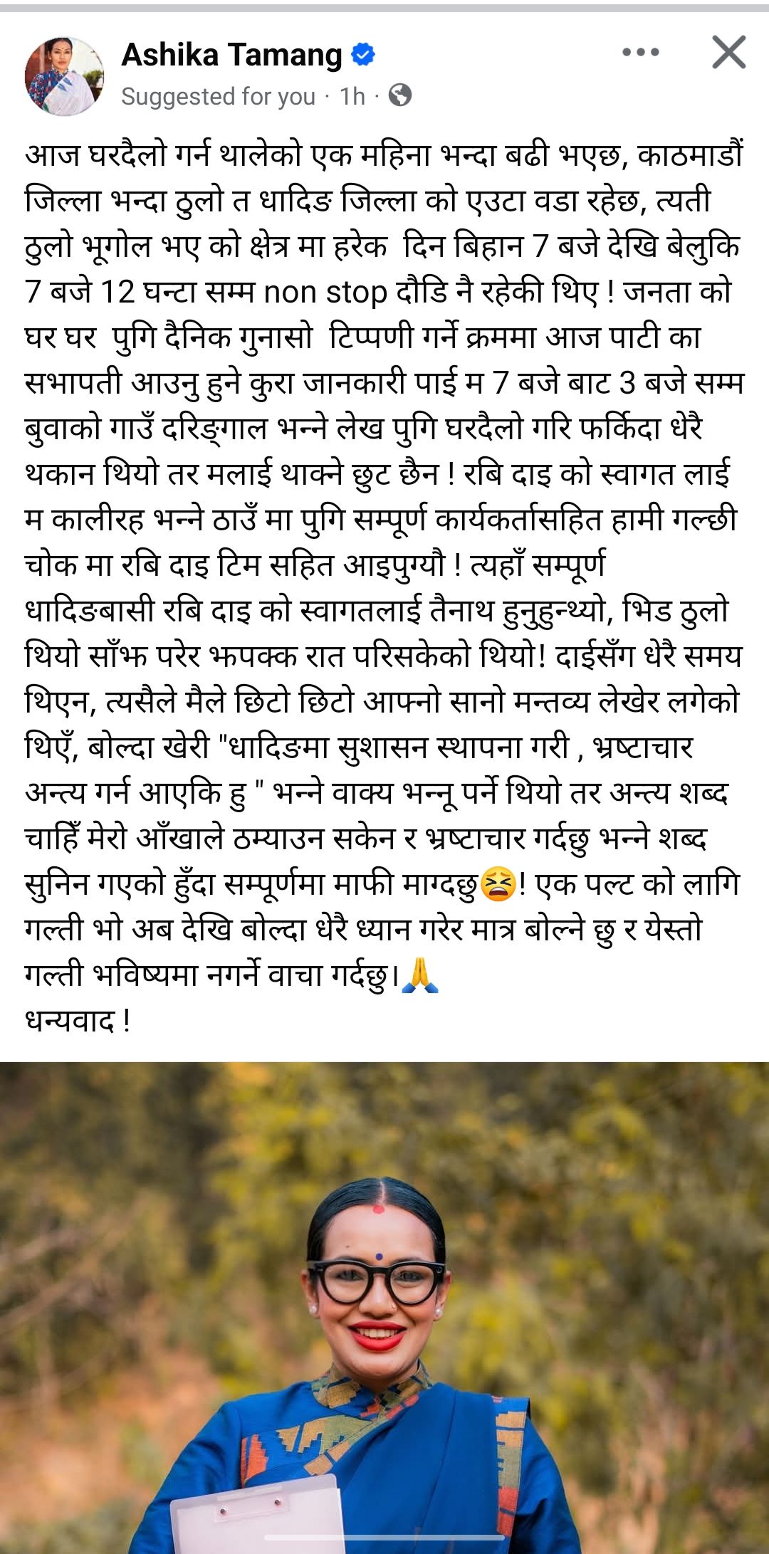 “एकपटकका लागि गल्ती भयो, अबदेखि बोल्दा धेरै ध्यान दिनेछु र भविष्यमा यस्तो गल्ती नदोहोर्याउने वाचा गर्दछु,” उनले लेखेकी छन्। साथै, आफ्नो अभियान सुशासन र भ्रष्टाचारविरुद्ध नै केन्द्रित रहने दोहोर्याएकी छन्।