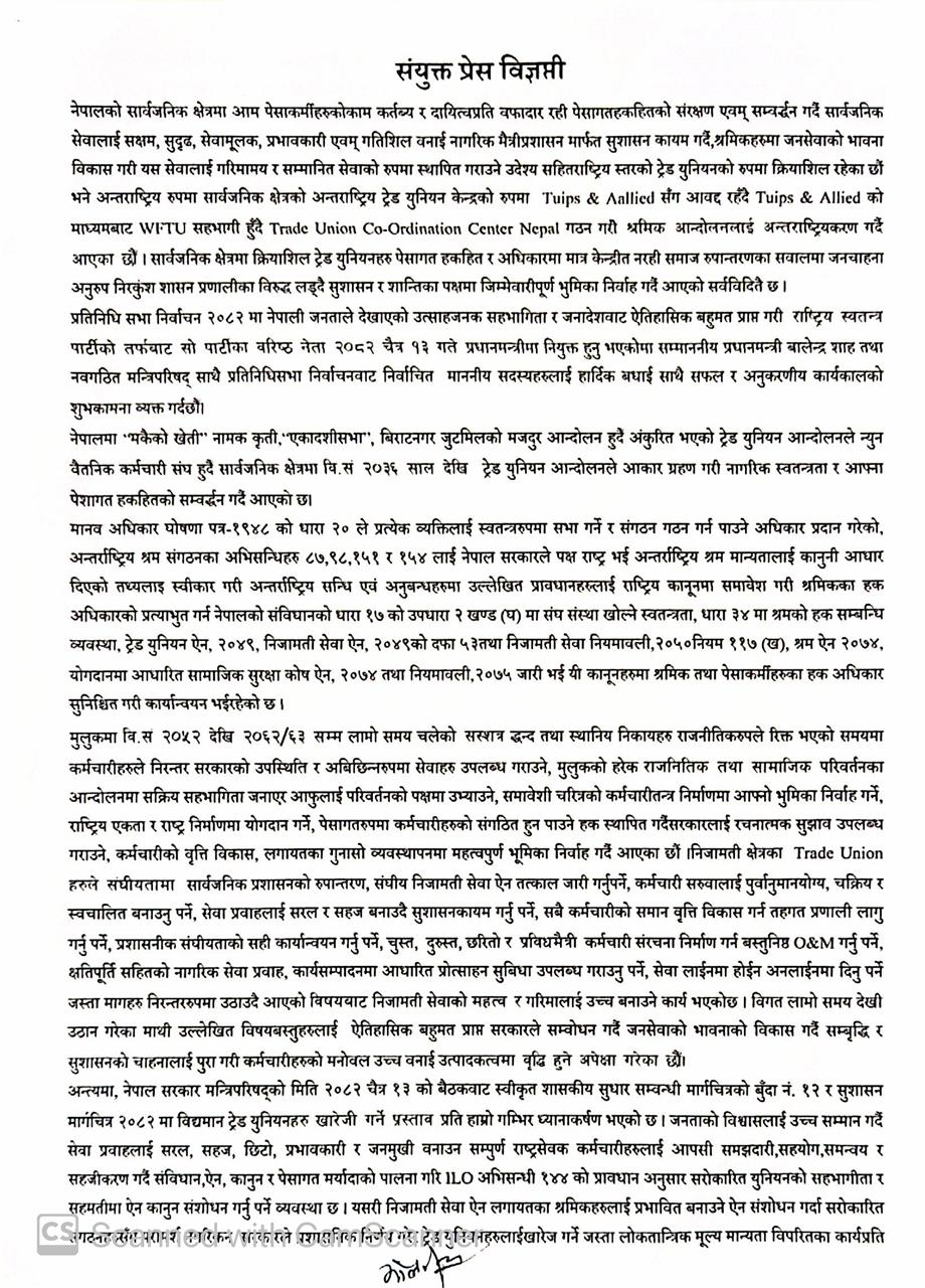 संयुक्त प्रेस विज्ञप्ति जारी गर्दै विभिन्न कर्मचारी तथा पेशागत संगठनहरूले कर्मचारीको सेवा, सुविधा र अधिकारसँग सम्बन्धित विषयमा एकतर्फी ढंगले निर्णय गरिएको आरोप लगाएका छन्। उनीहरूले यस्तो कदम लोकतान्त्रिक मूल्य, कानुनी व्यवस्था र अन्तर्राष्ट्रिय श्रम मान्यताविपरीत भएको ठहर गरेका छन्।