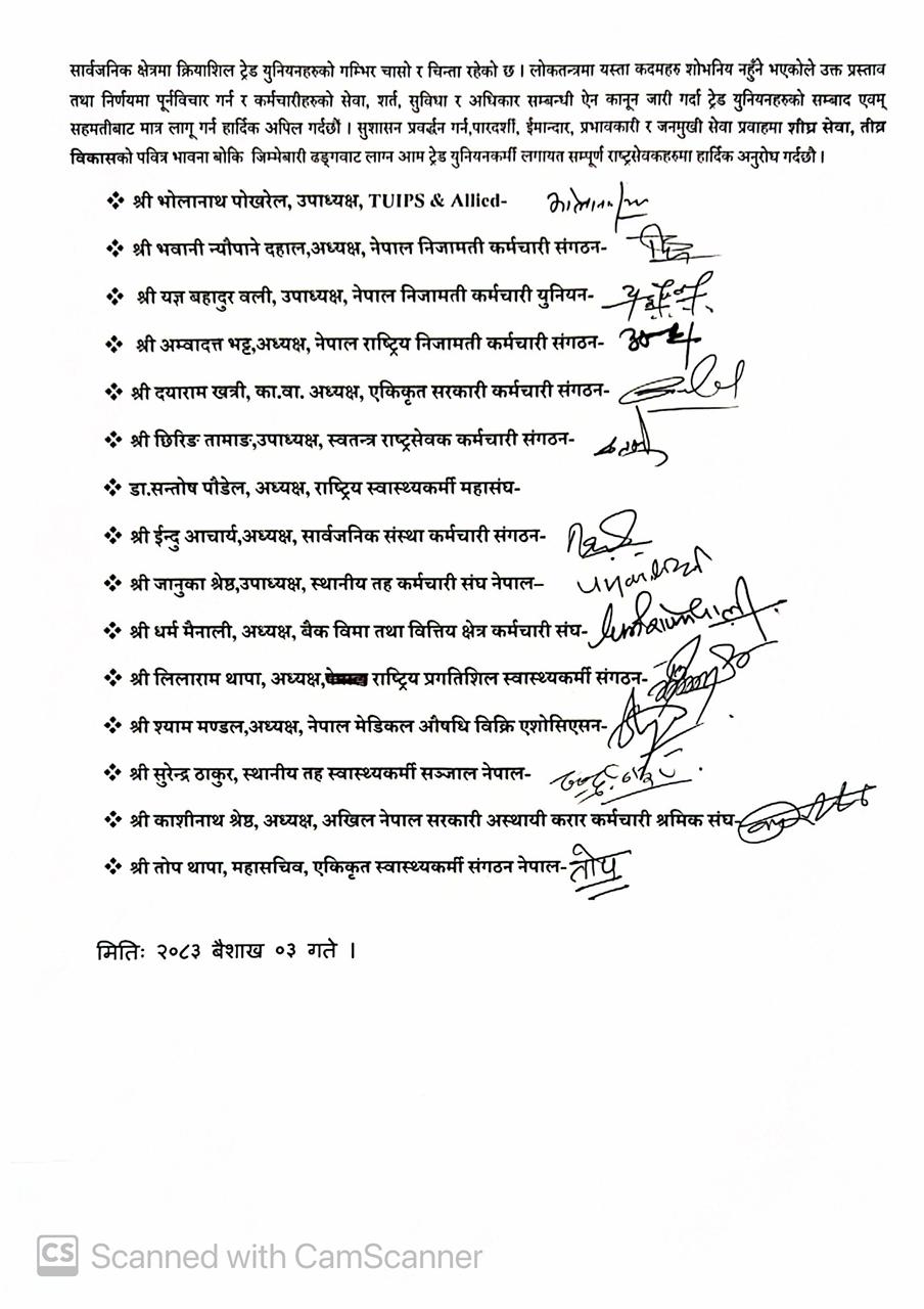 साथै, पारदर्शिता, जवाफदेहिता र सुशासनको नाममा कर्मचारीको अधिकार कुण्ठित गर्ने प्रयास नगर्न सरकारलाई सचेत गराइएको छ। यदि यस्ता गतिविधि रोकिएन भने चरणबद्ध आन्दोलनको कार्यक्रम सार्वजनिक गरिने चेतावनीसमेत दिइएको छ।