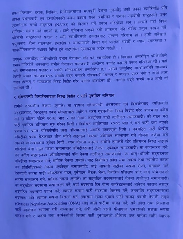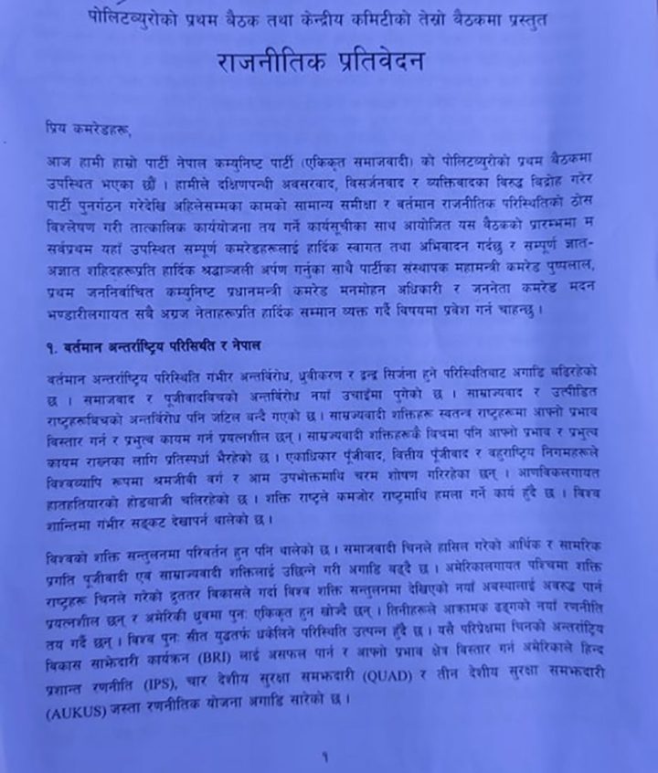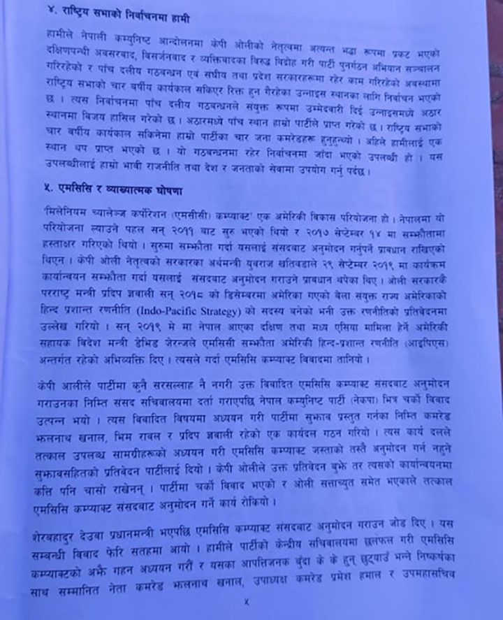 बुधबार पार्टीको पोलिट्ब्युरो समितिको बैठकमा राजनीतिक प्रतिवेदन पेस गर्दै उनले एमसीसी ‘व्याख्यात्मक घोषणासहित’पारित गर्नु आफ्नाे पार्टीकाे मुख्य भूमिका रहेकाे नेपालले बताएका हुन् ।