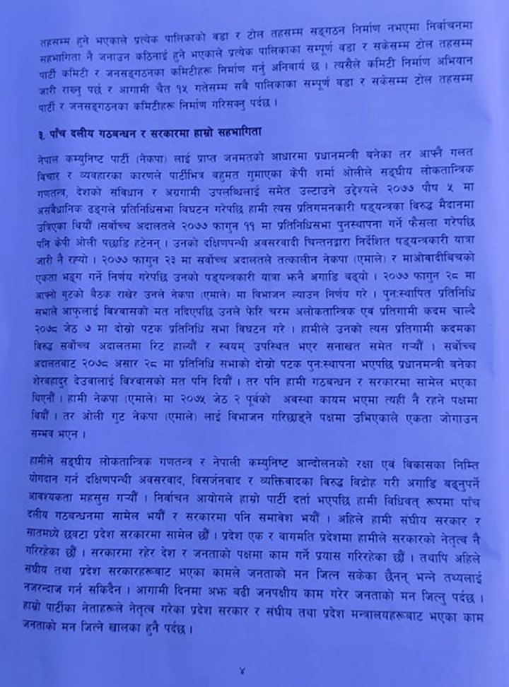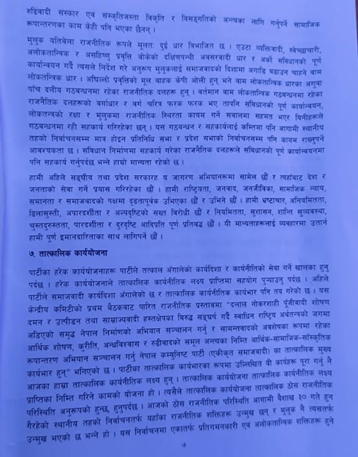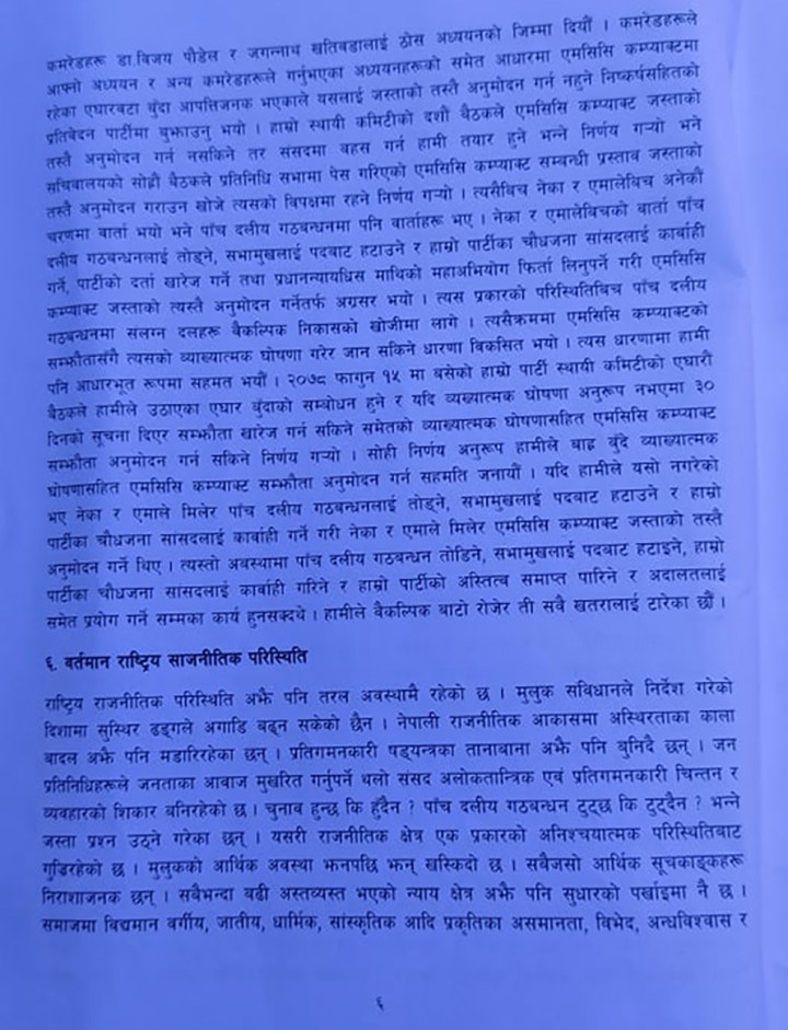 ‘हाम्रो पार्टीले उक्त कम्प्याक्टमा भएका कतिपय गलत र दोहोरो अर्थ लाग्ने विषयहरुको बारेमा स्पष्ट निरुपण नगरी अनुमोदन गर्न हुँदैन भनेर निर्णयसहित दृढ अडान लियो, हाम्रो पार्टीको अडान नै हाम्रो राष्ट्रिय अडान बन्यो’ अध्यक्ष नेपालले भने ।